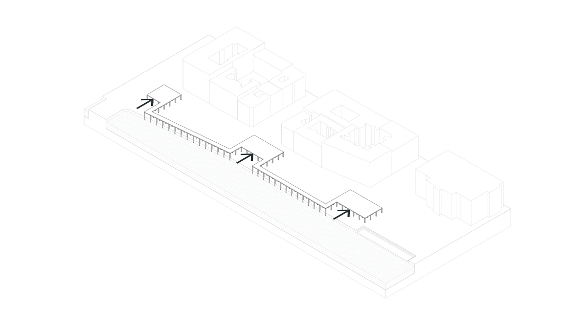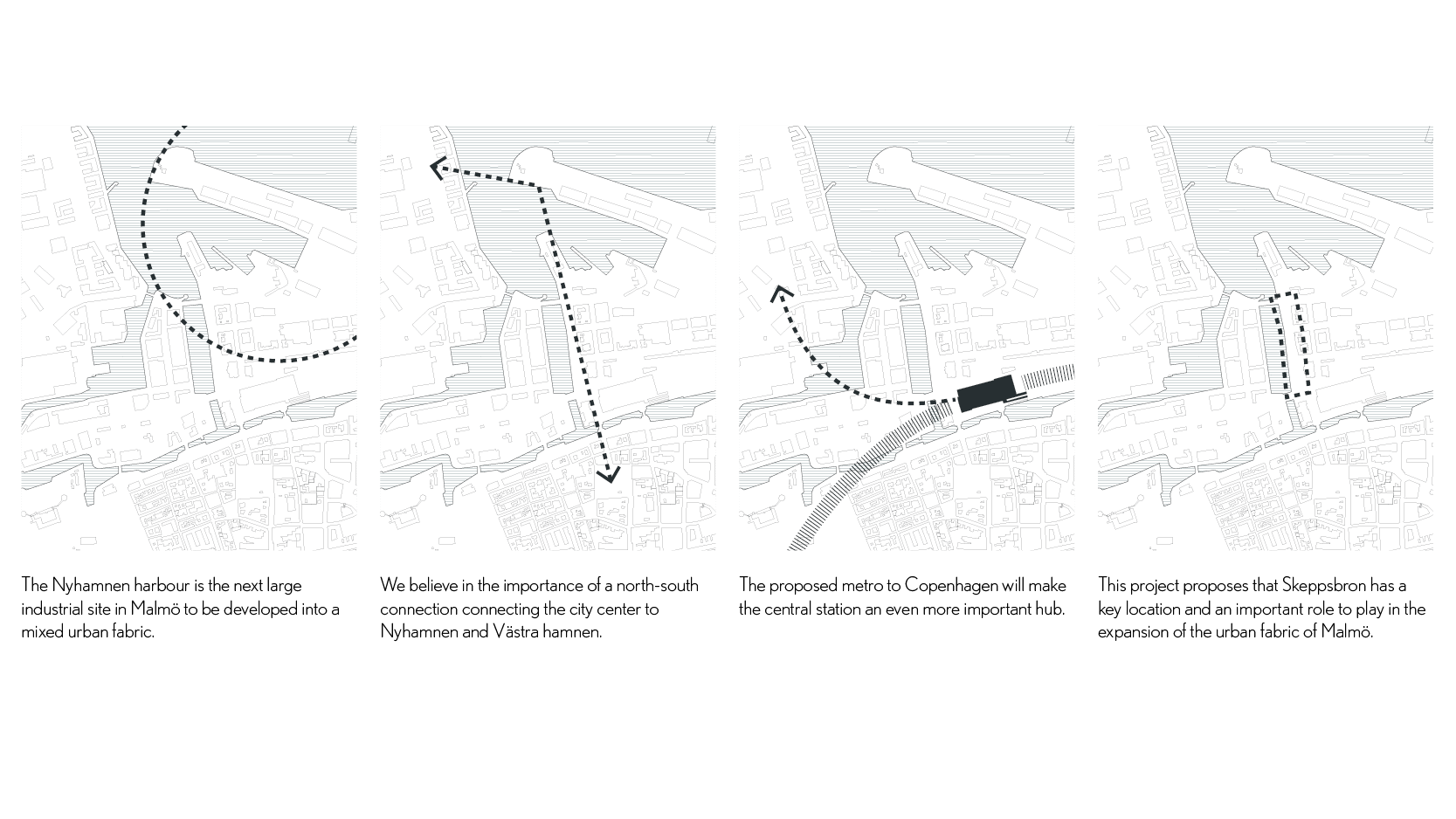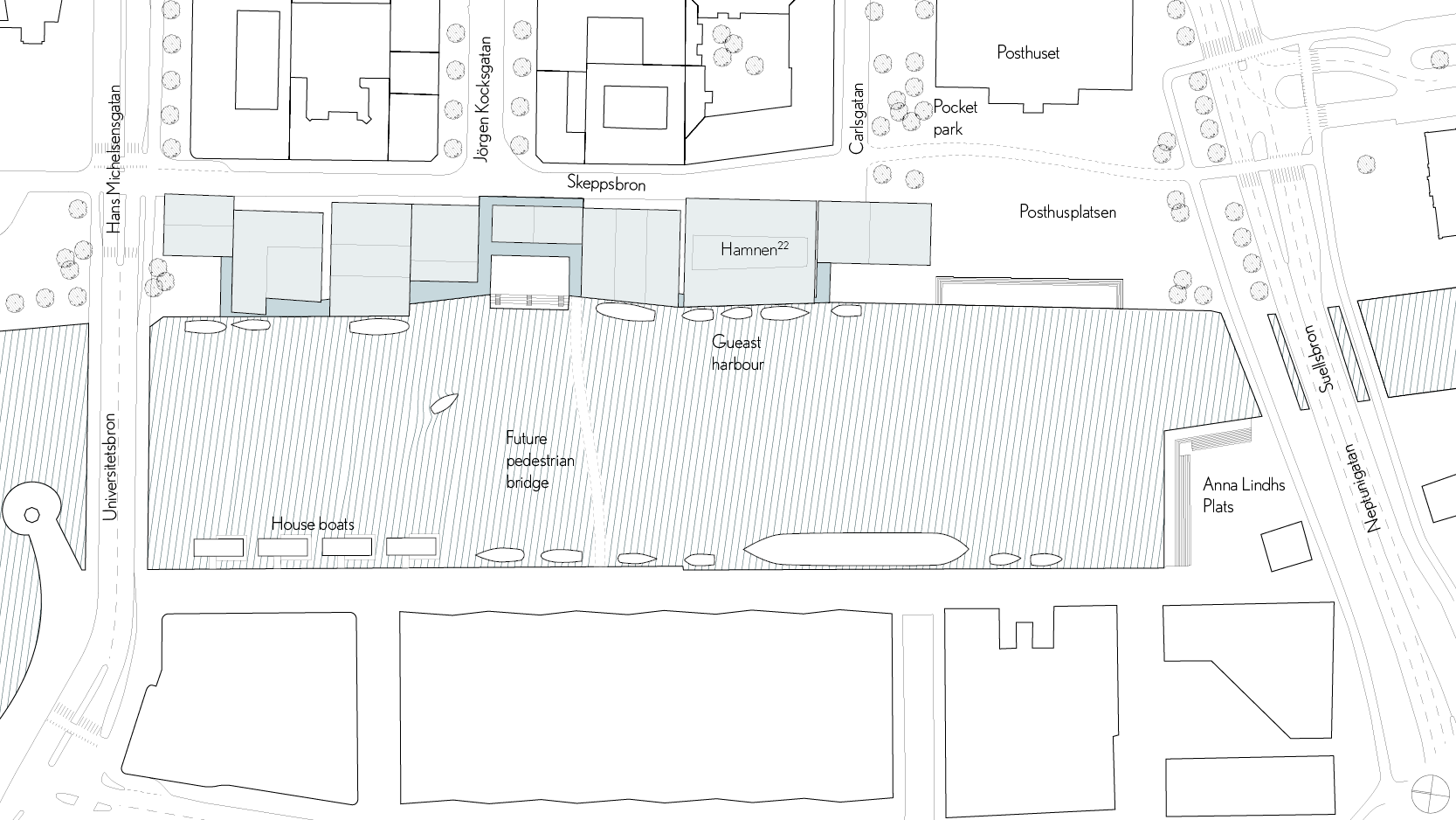 Skeppsbron is a dock in the center of Malmö that before Öresundsbron was a key location for communication with trains to Lund and ferrys to Copenhagen and Kastrup airport. Today, it is a parking lot in a big scaled surrounding facing water and the evening sun with an undefined plaza to the south.