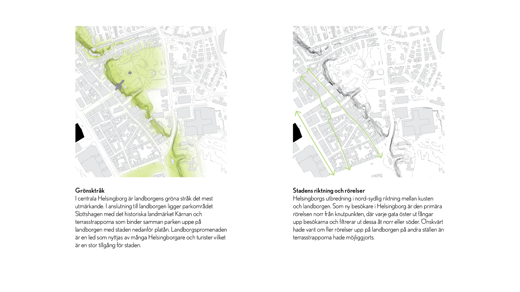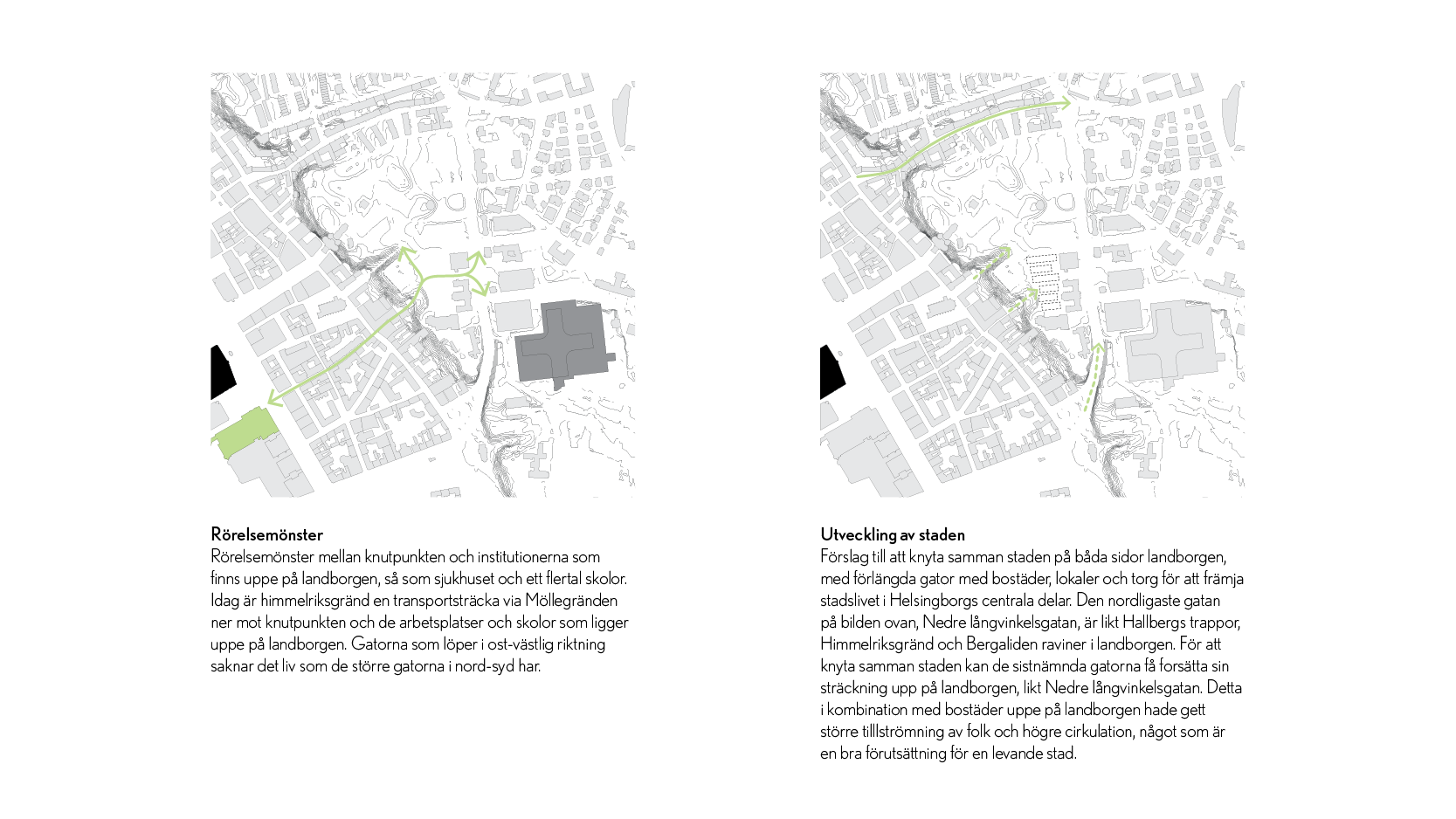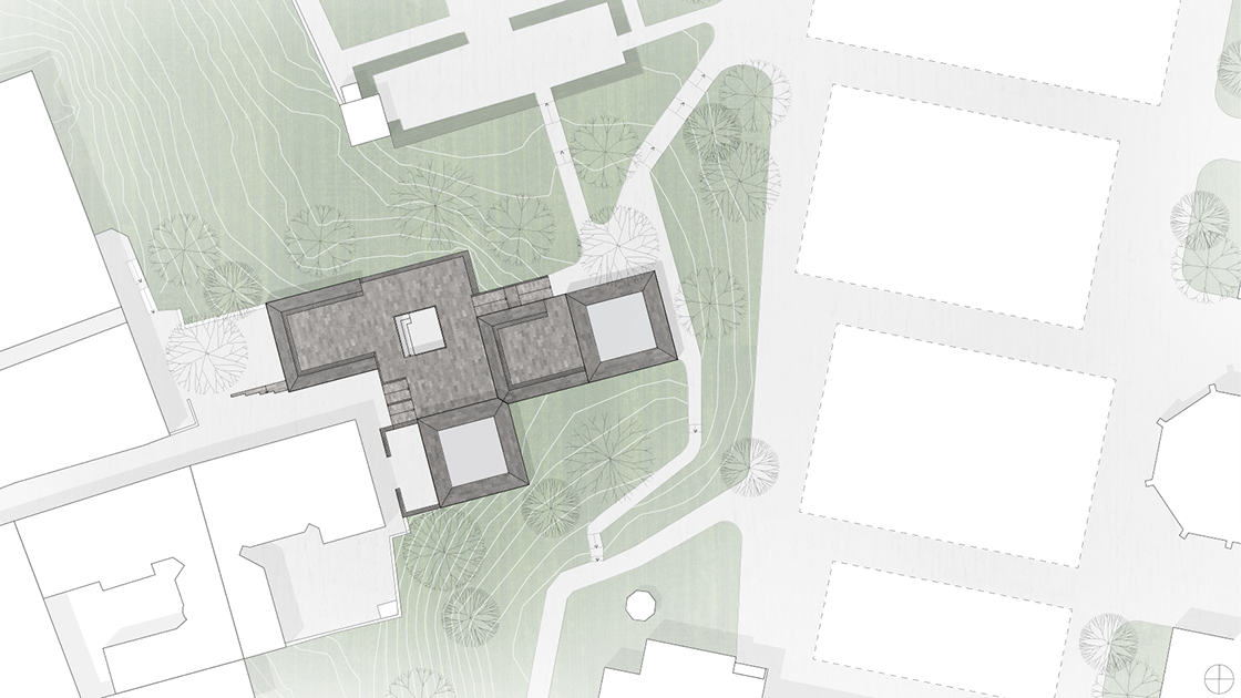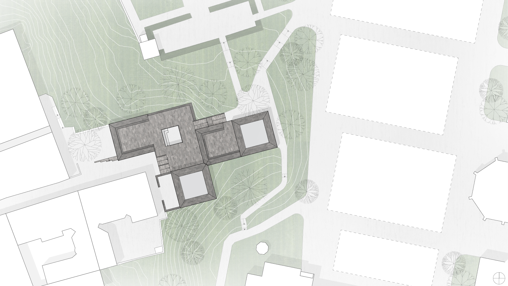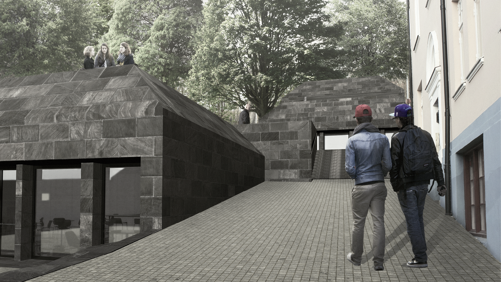 Med dessa förutsättningar och en karaktär av hus i park vill jag göra en historisk och platsspecifik återkopplig. Både i upplevelsen av rummen mellan byggnaderna, rörelsen från Himmelriksgränd upp på landborgen och i det lokala materialvalet som är lerskiffer.
