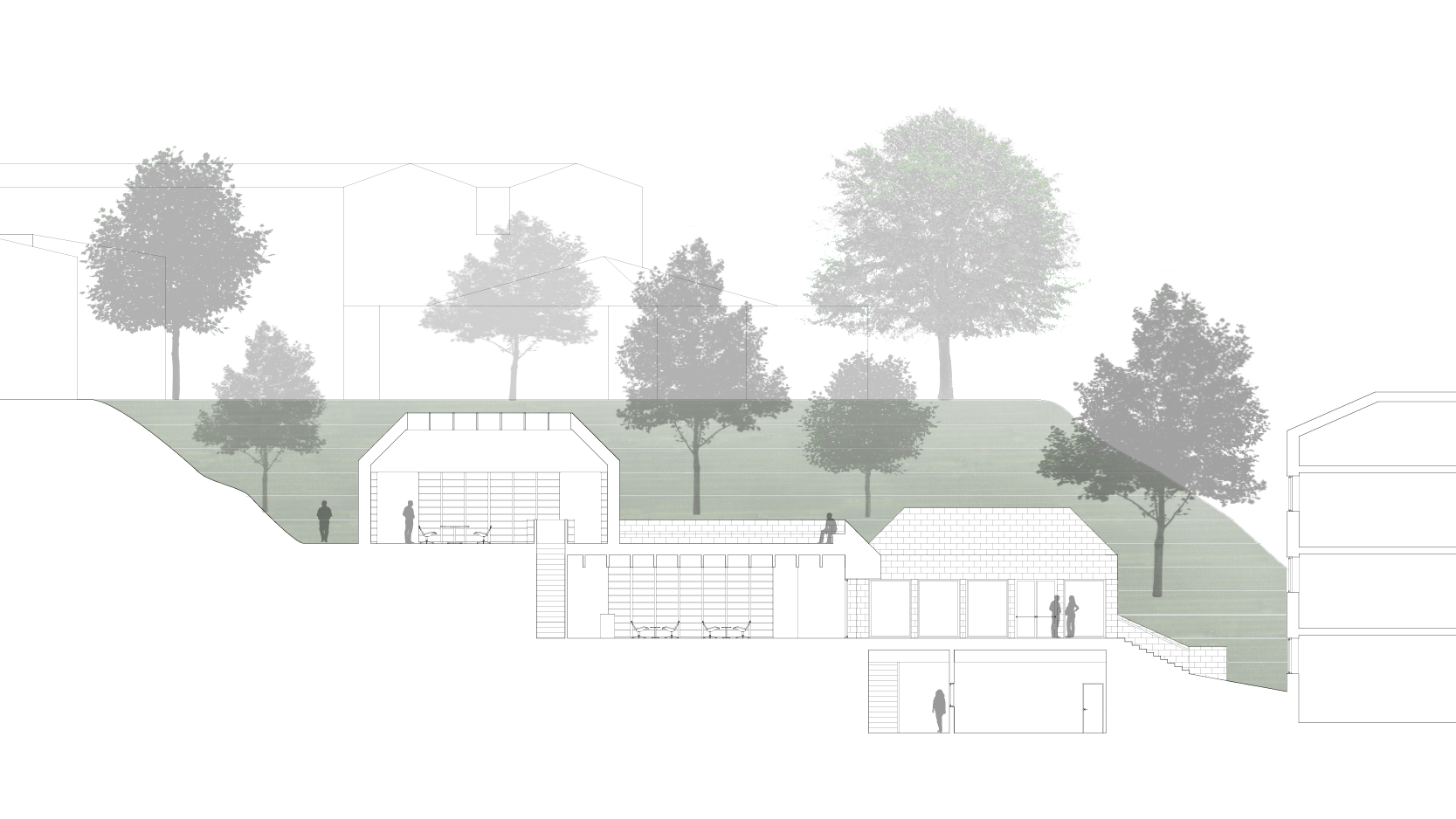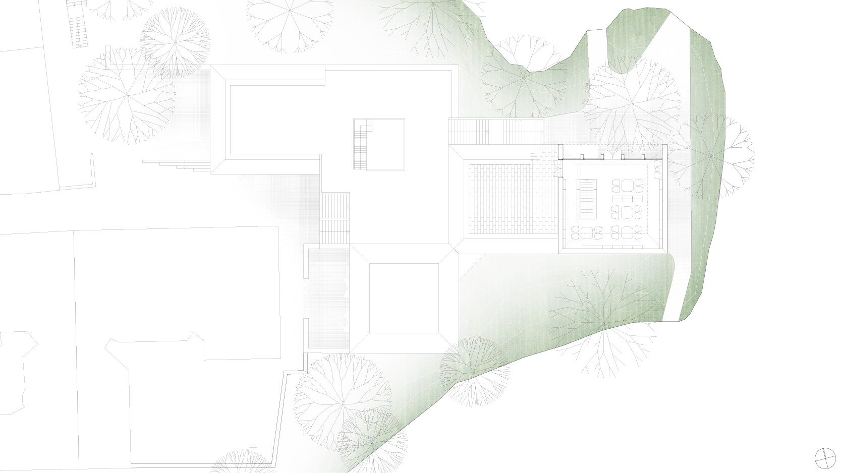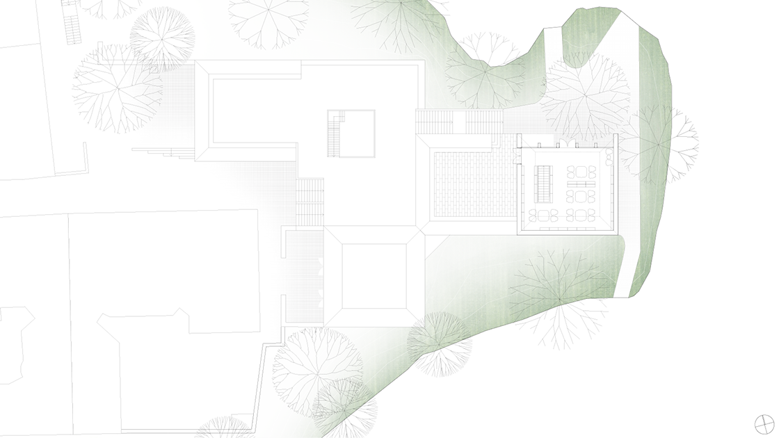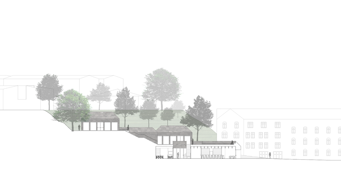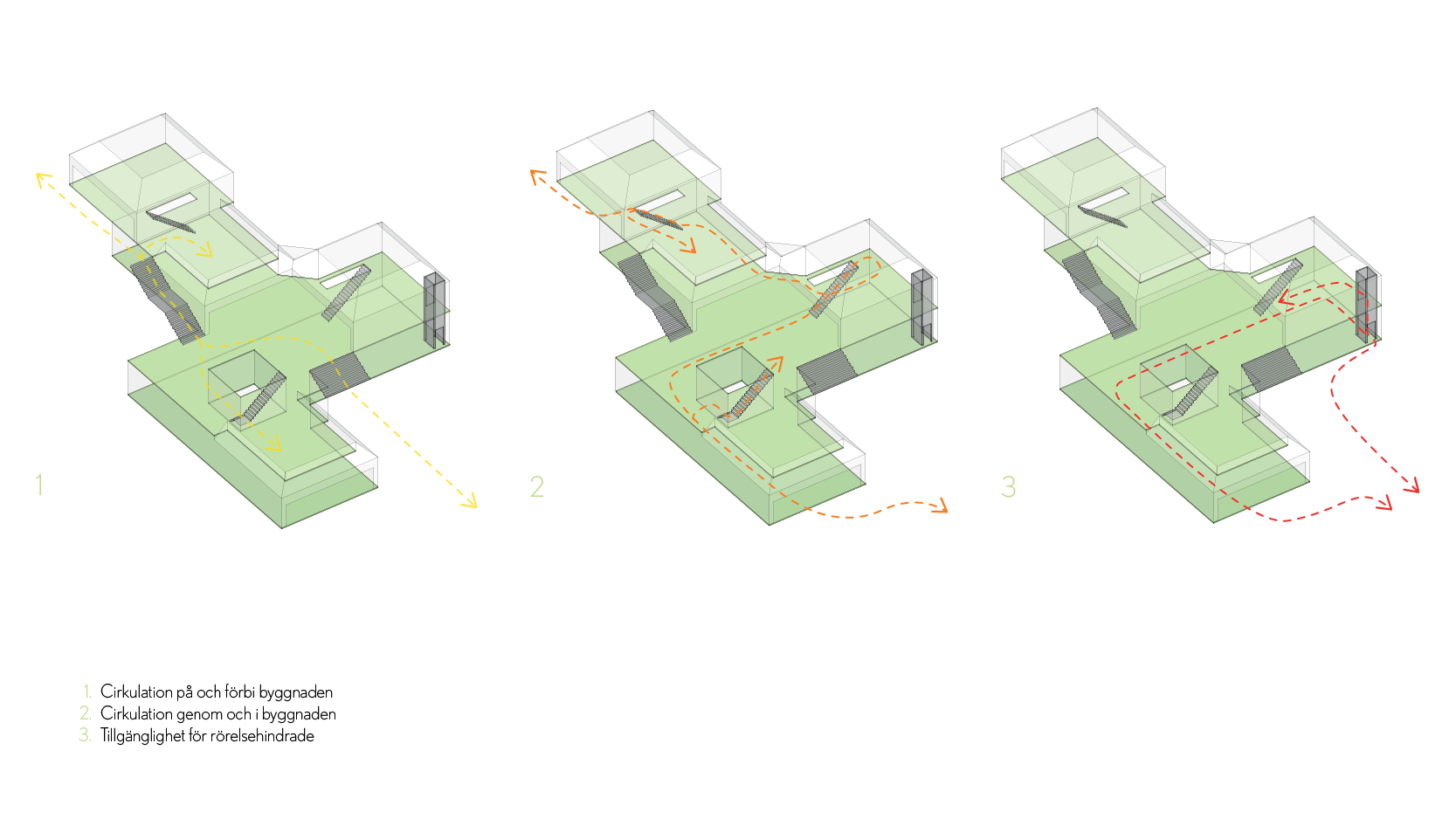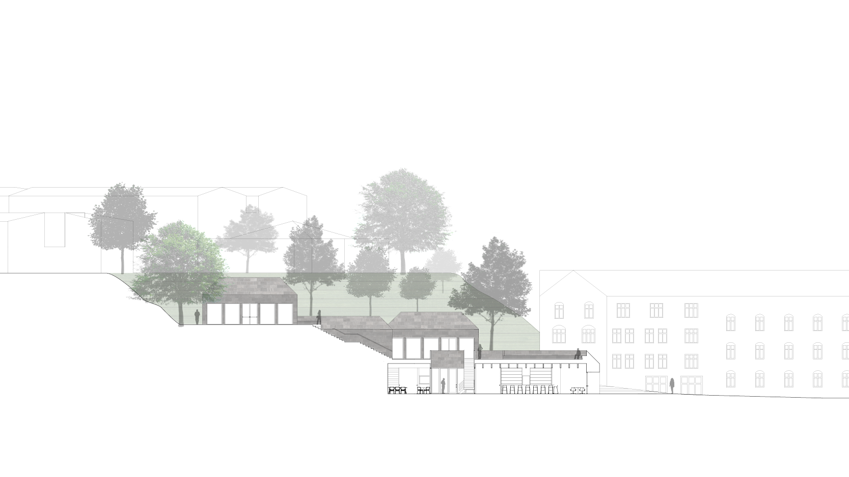 Med dessa förutsättningar och en karaktär av hus i park vill jag göra en historisk och platsspecifik återkopplig. Både i upplevelsen av rummen mellan byggnaderna, rörelsen från Himmelriksgränd upp på landborgen och i det lokala materialvalet som är lerskiffer.