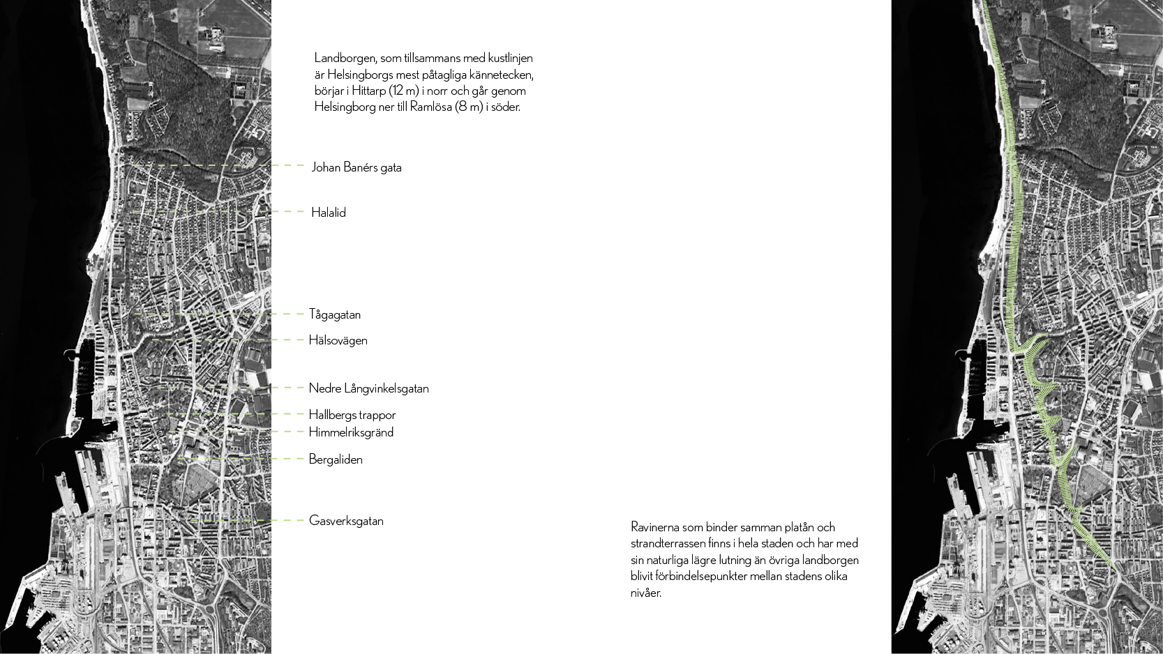 Längs landborgen finns raviner som har bildats av smältvatten från inlandsisen. Dessa används idag för att koppla samman staden som ligger nedanför landborgskanten längs kusten och den delen av staden som ligger uppe på platån.