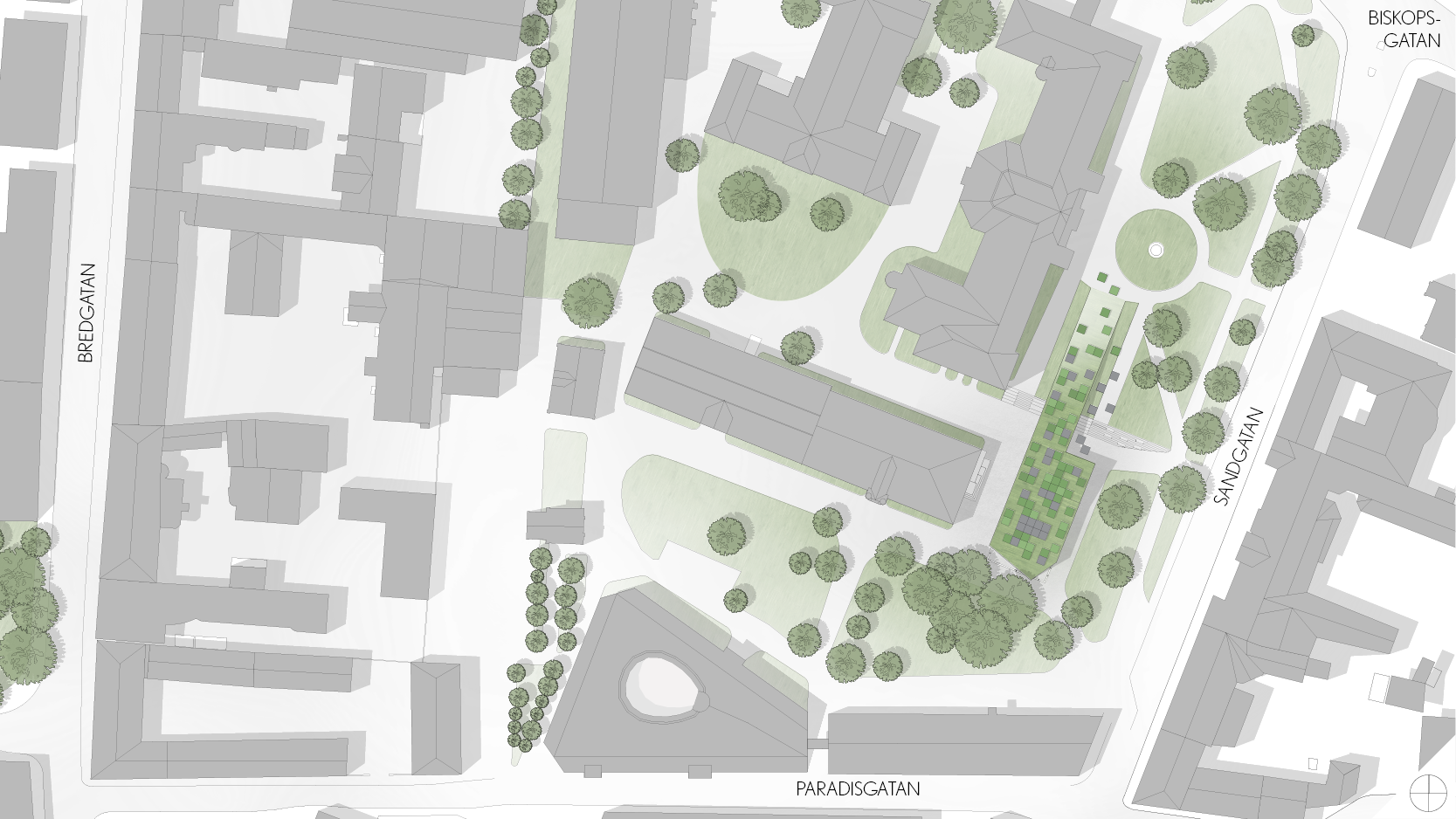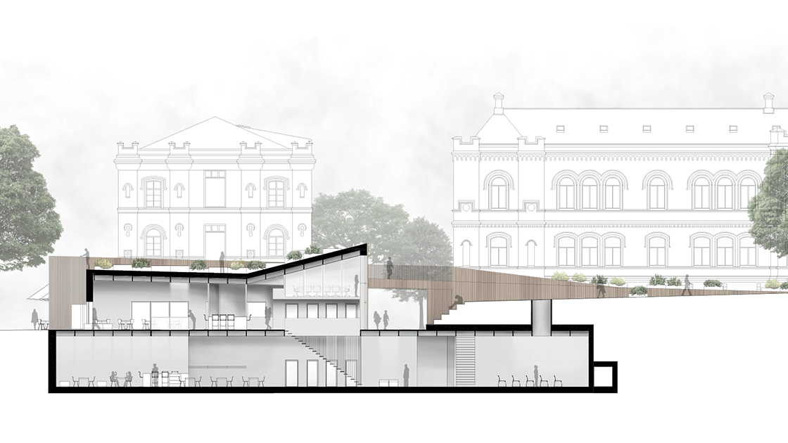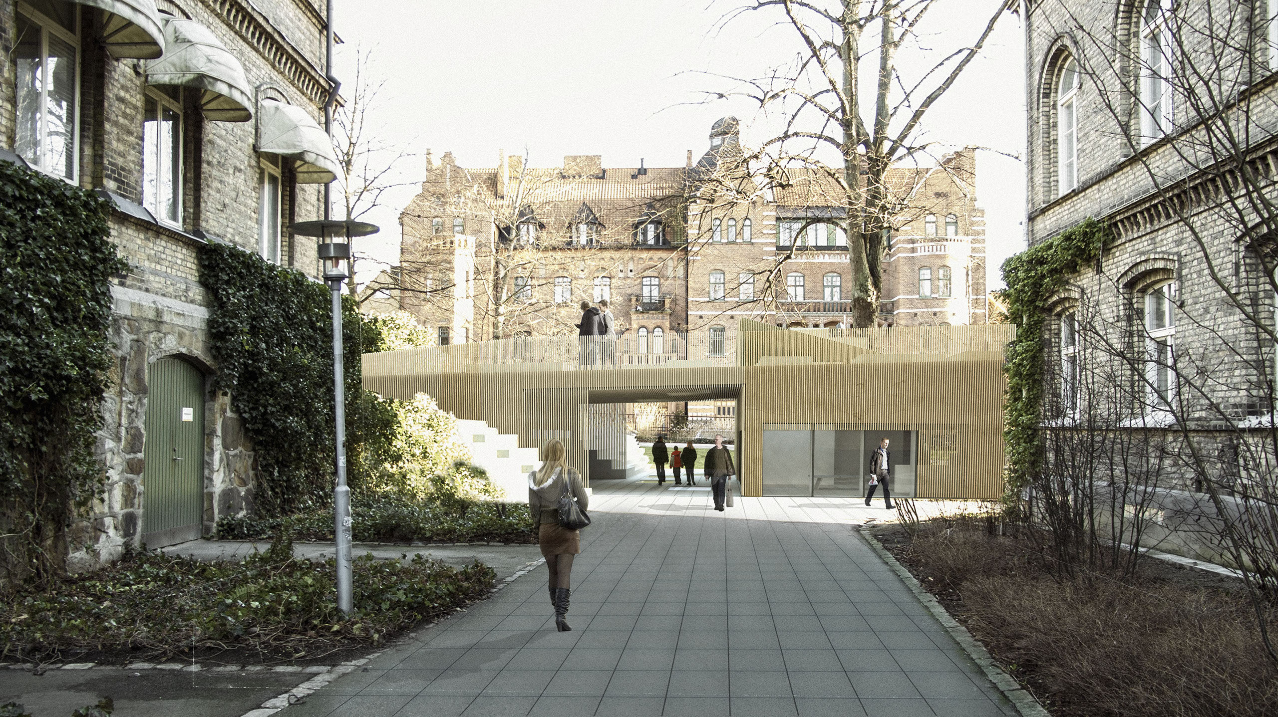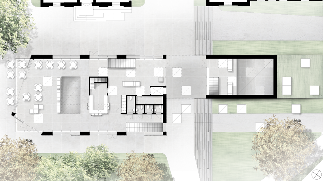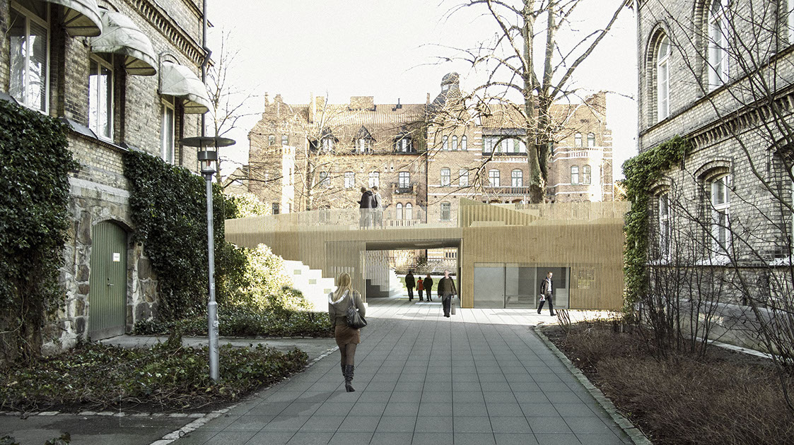Byggnaden ska tillföra nya kvaliteter till kvarteret utan att ta någon egentlig vistelseyta i anspråk. Här används bland annat platsens topografi för att möjliggöra detta.