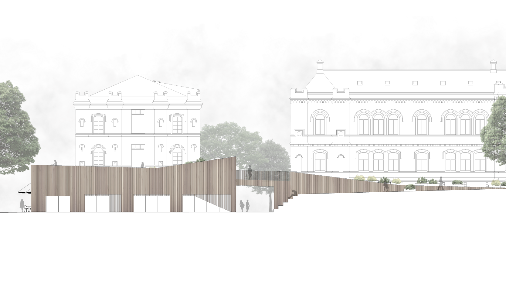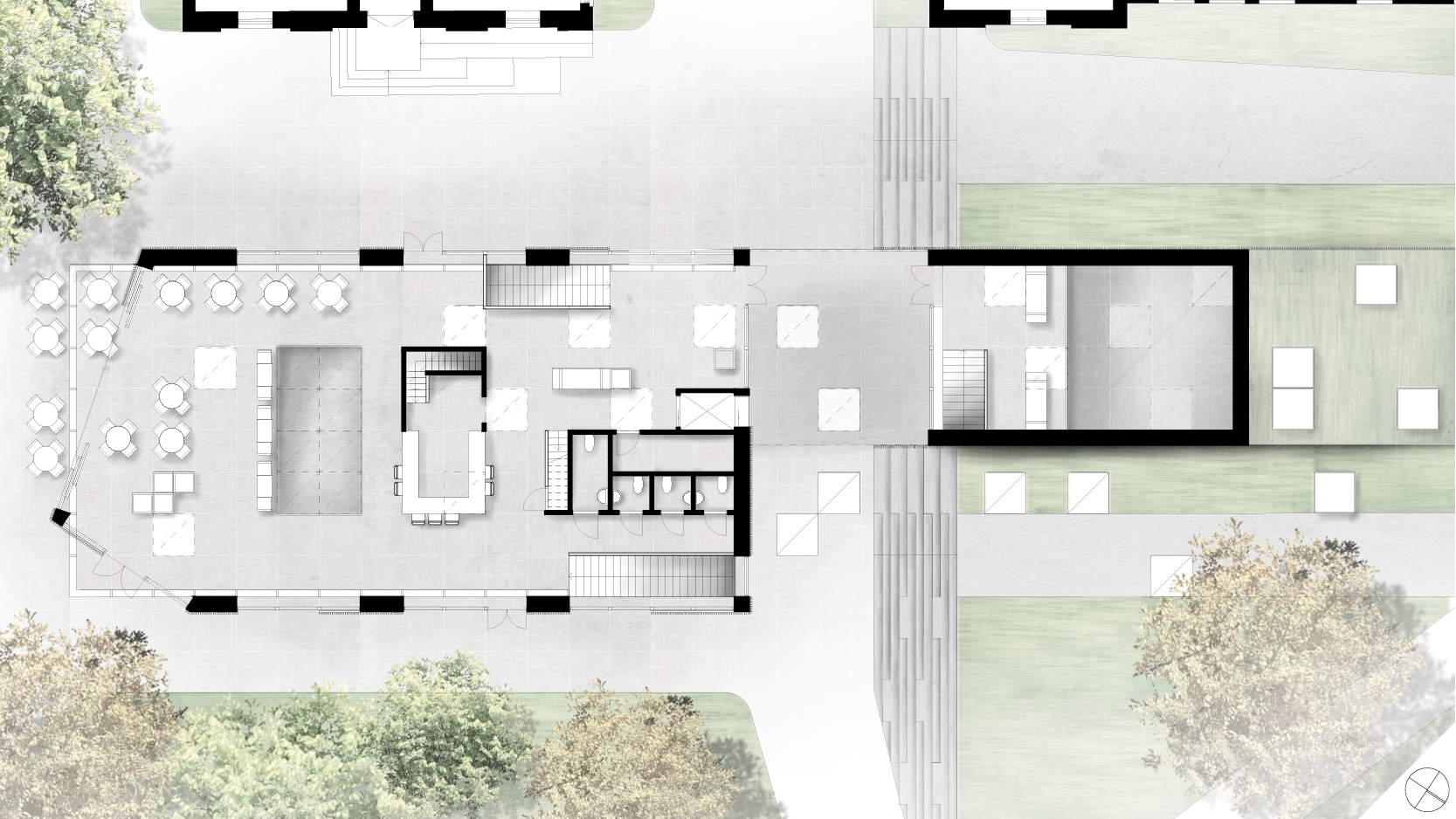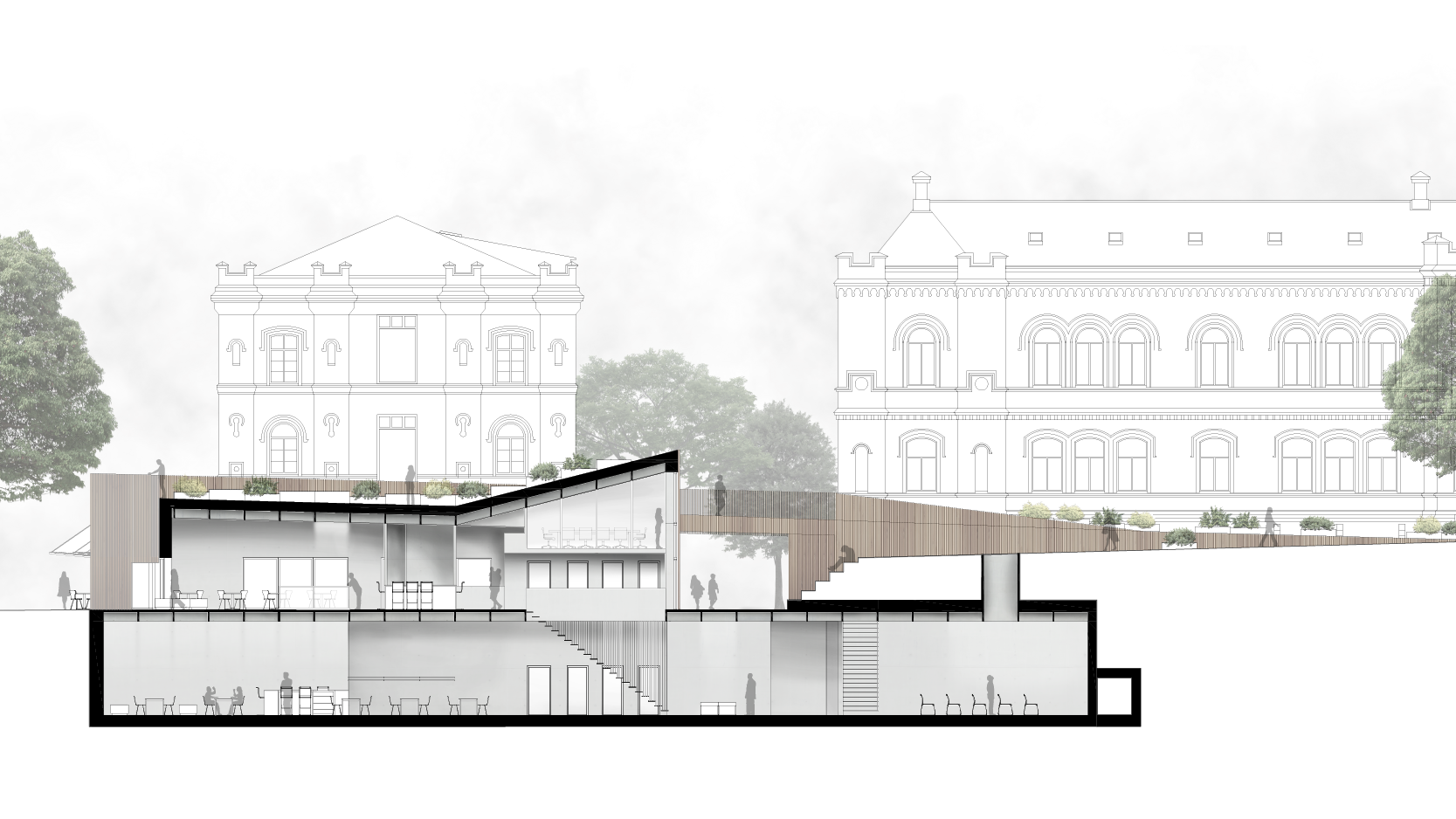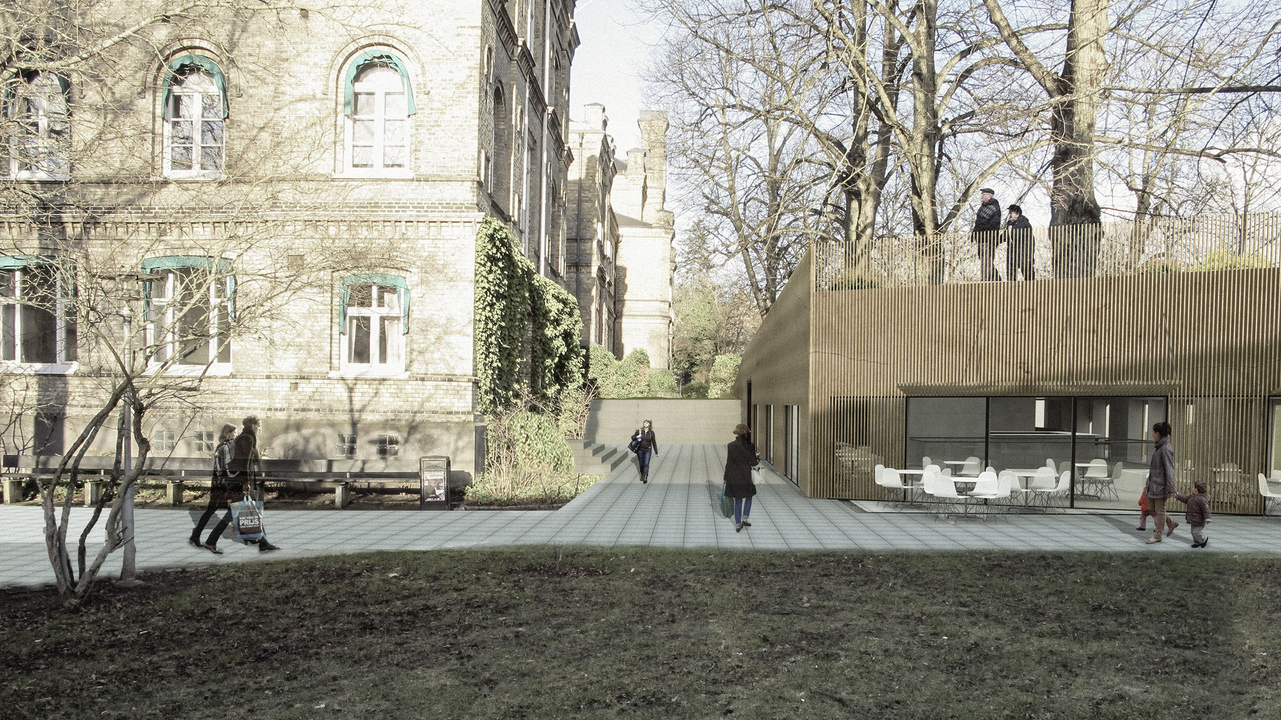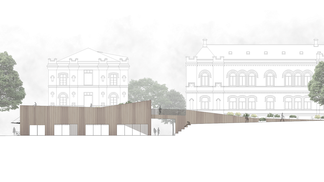 Byggnaden ska tillföra nya kvaliteter till kvarteret utan att ta någon egentlig vistelseyta i anspråk. Här används bland annat platsens topografi för att möjliggöra detta.