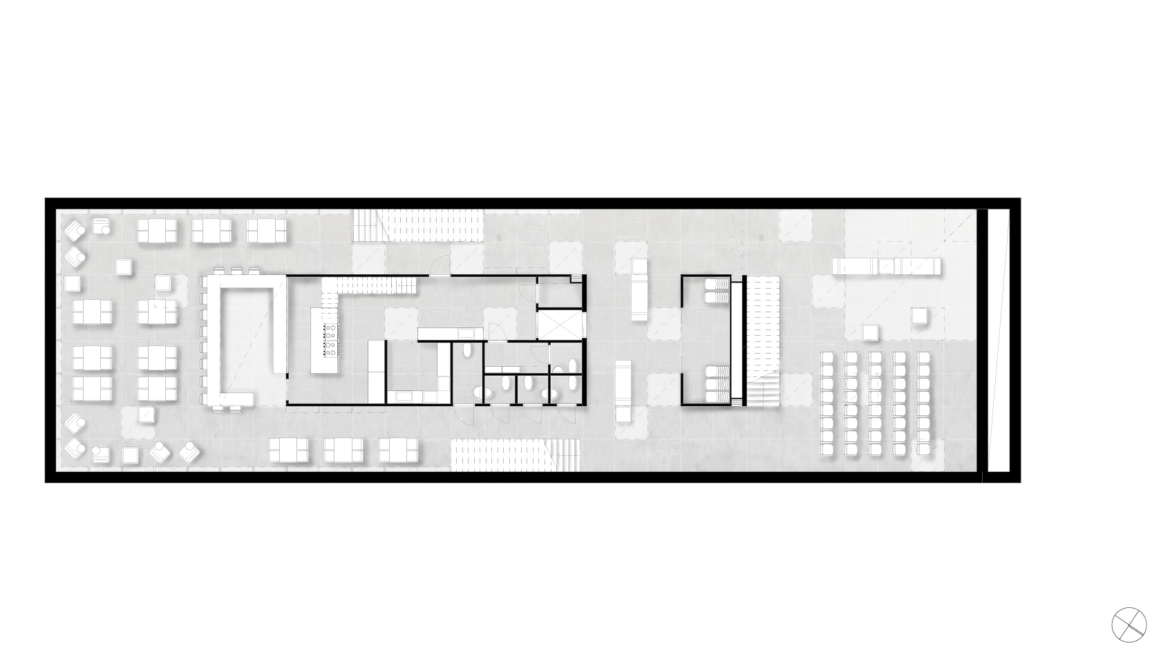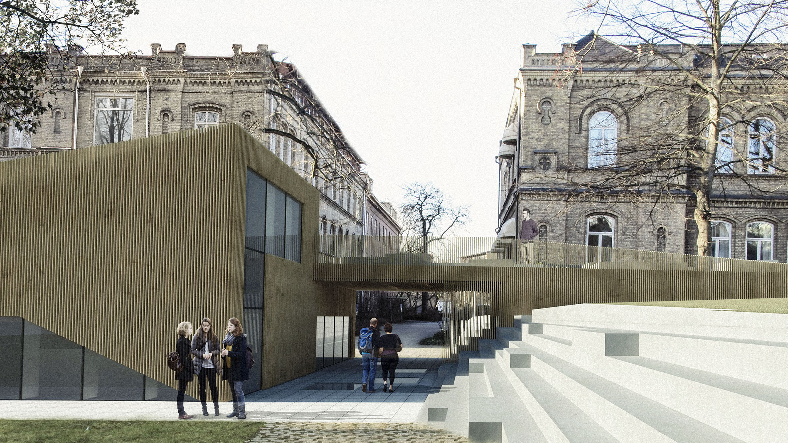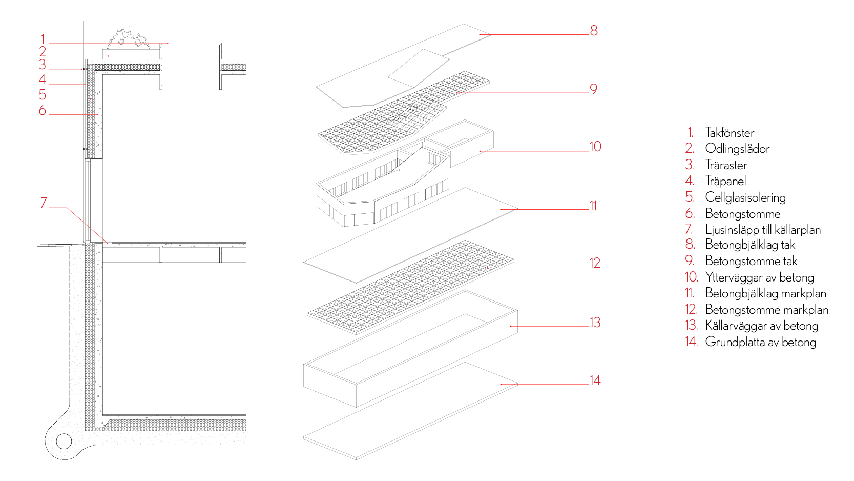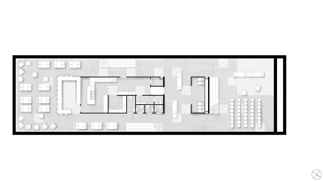 Byggnaden ska tillföra nya kvaliteter till kvarteret utan att ta någon egentlig vistelseyta i anspråk. Här används bland annat platsens topografi för att möjliggöra detta.