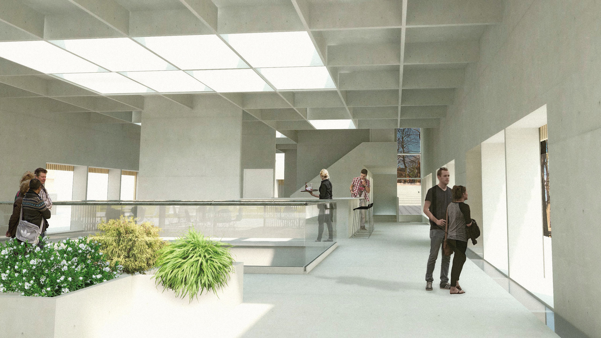 Mötesplatser som kan användas över hela året. Exteriöra och interiöra rum ingår i symbios där detta möjliggörs av tillägget.